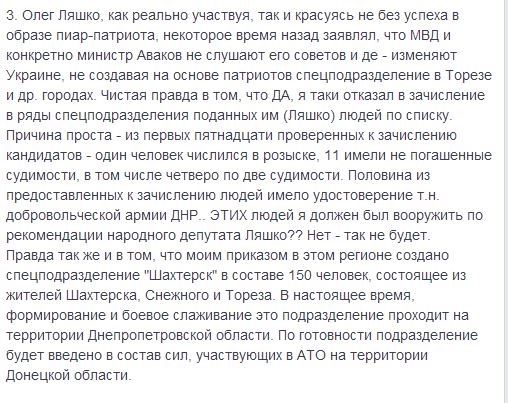 Ранее нардеп Ляшко призвал к освобождению от должности главы МВД Арсена Авакова. По его мнению, в оккупации террористами Снежного Донецкой области персонально виноват министр внутренних дел. По словам нардепа, он предвидел такое развитие событий, поэтому три недели подряд убеждал Турчинова, Пашинского и Авакова создать в Снежном, Торезе и Шахтерске спецотряд милиции из числа местных жителей-патриотов, которых объединили, и выдать оружие, чтобы им было чем бороться с сепаратистами.