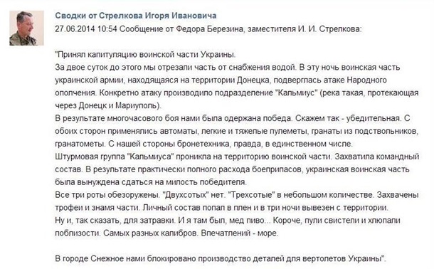 На странице ВКонтакте «Сводки от Стрелкова Игоря Ивановича» появилось сообщение от заместителя Игоря Стрелкова Федора Березина.